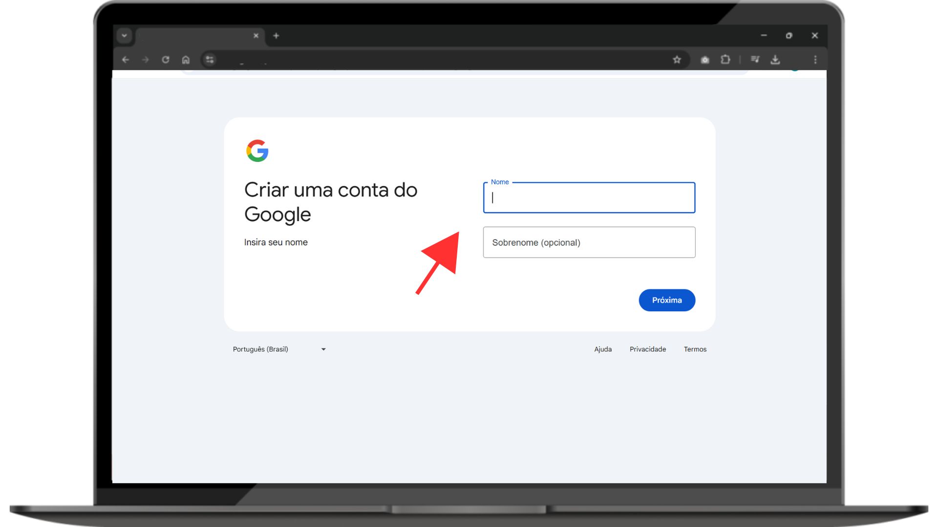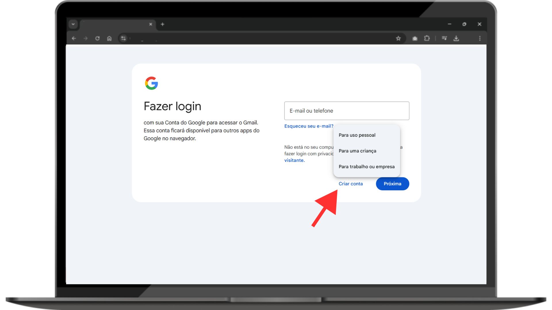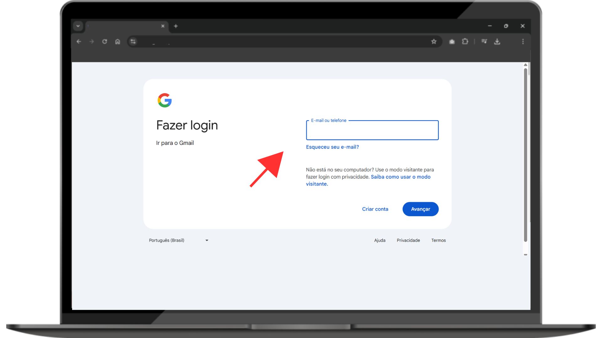 * No campo de endereço do navegador, digite www.gmail.com e pressione Enter.