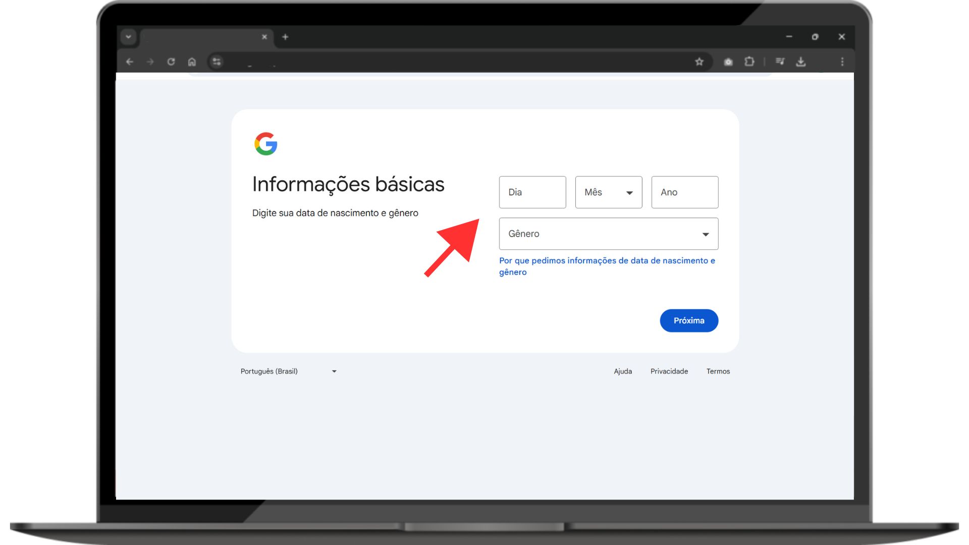 * Data de Nascimento: preencha com sua data de nascimento e gênero.