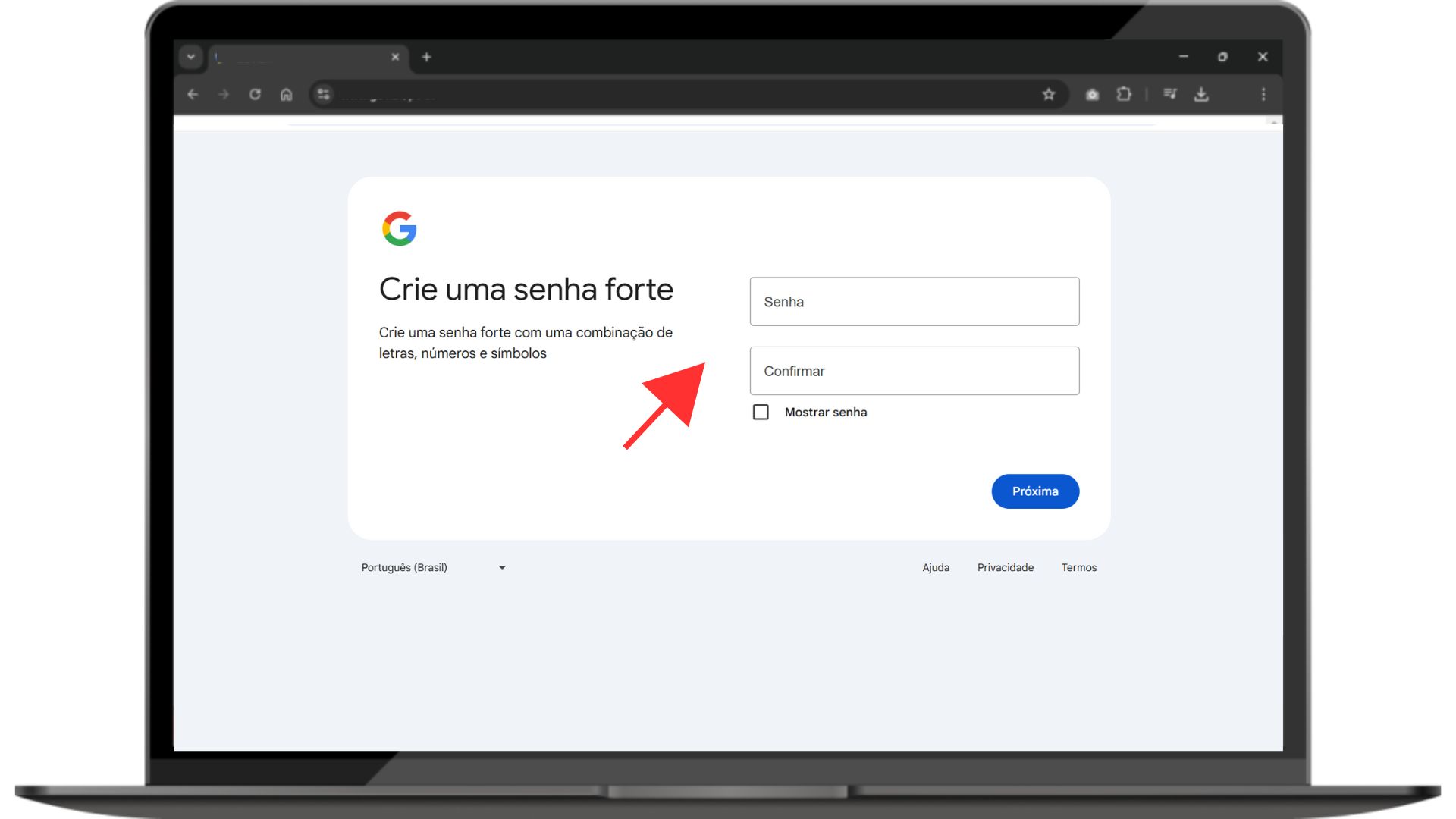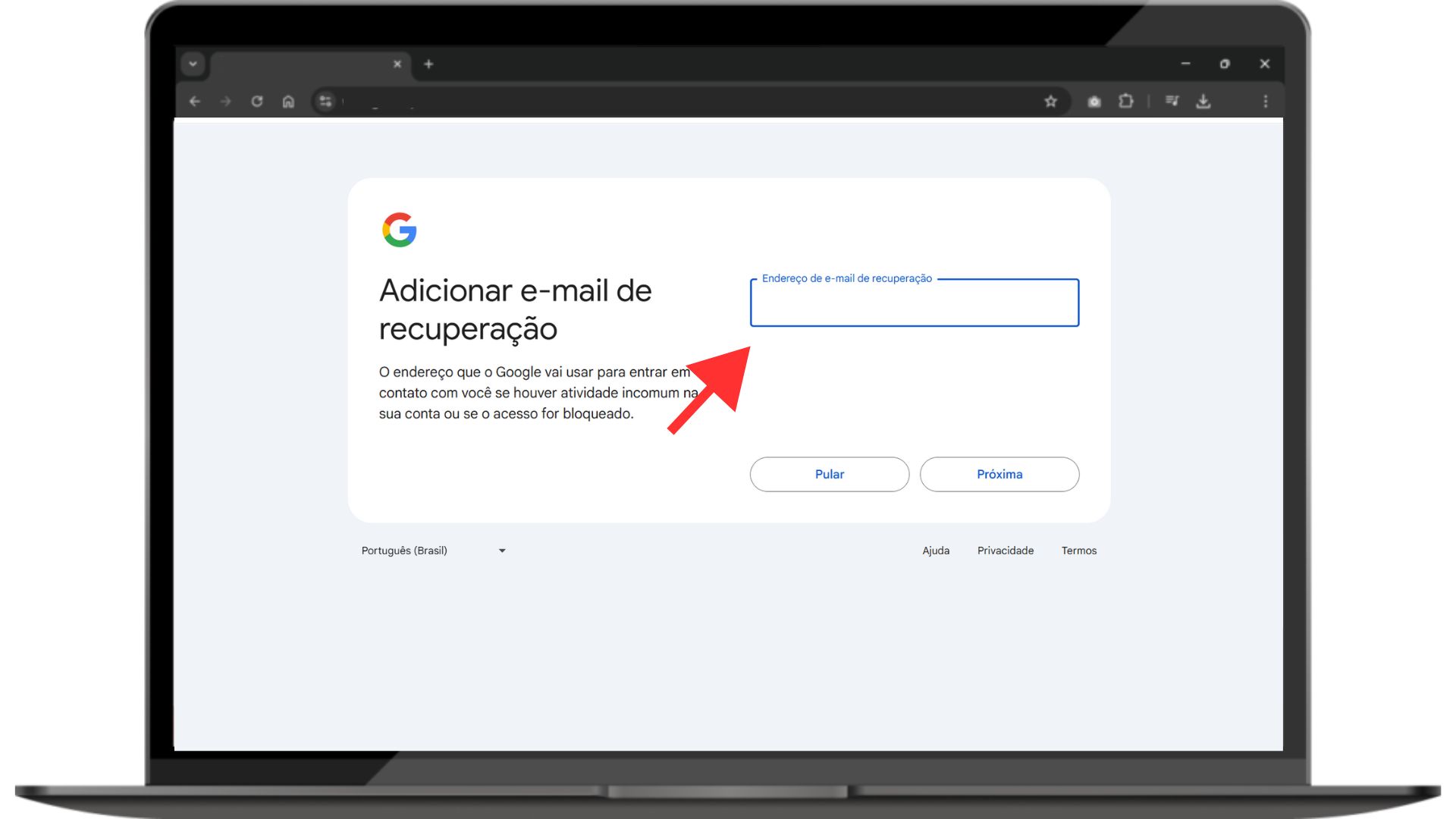 * E-mail de recuperação: Preencha com um e-mail alternativo para recuperação de informações ou pule a opção caso ainda não tenha outro e-mail.