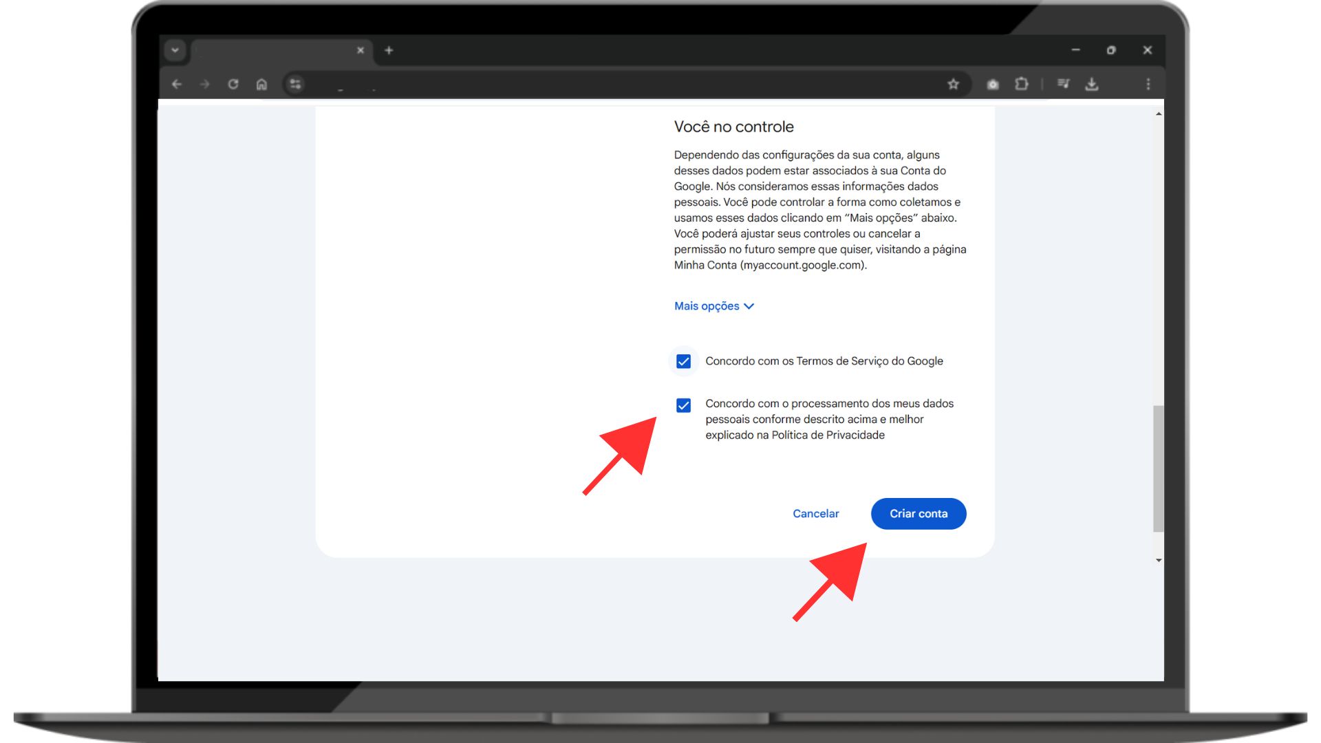 * Depois de preencher todas as informações e aceitar os termos de uso, clique em "Criar Conta".