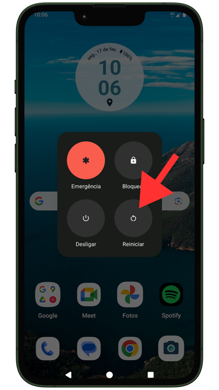 Segure o botão de "Ligar/Desligar" no celular ou computador até aparecer a opção "Reiniciar".